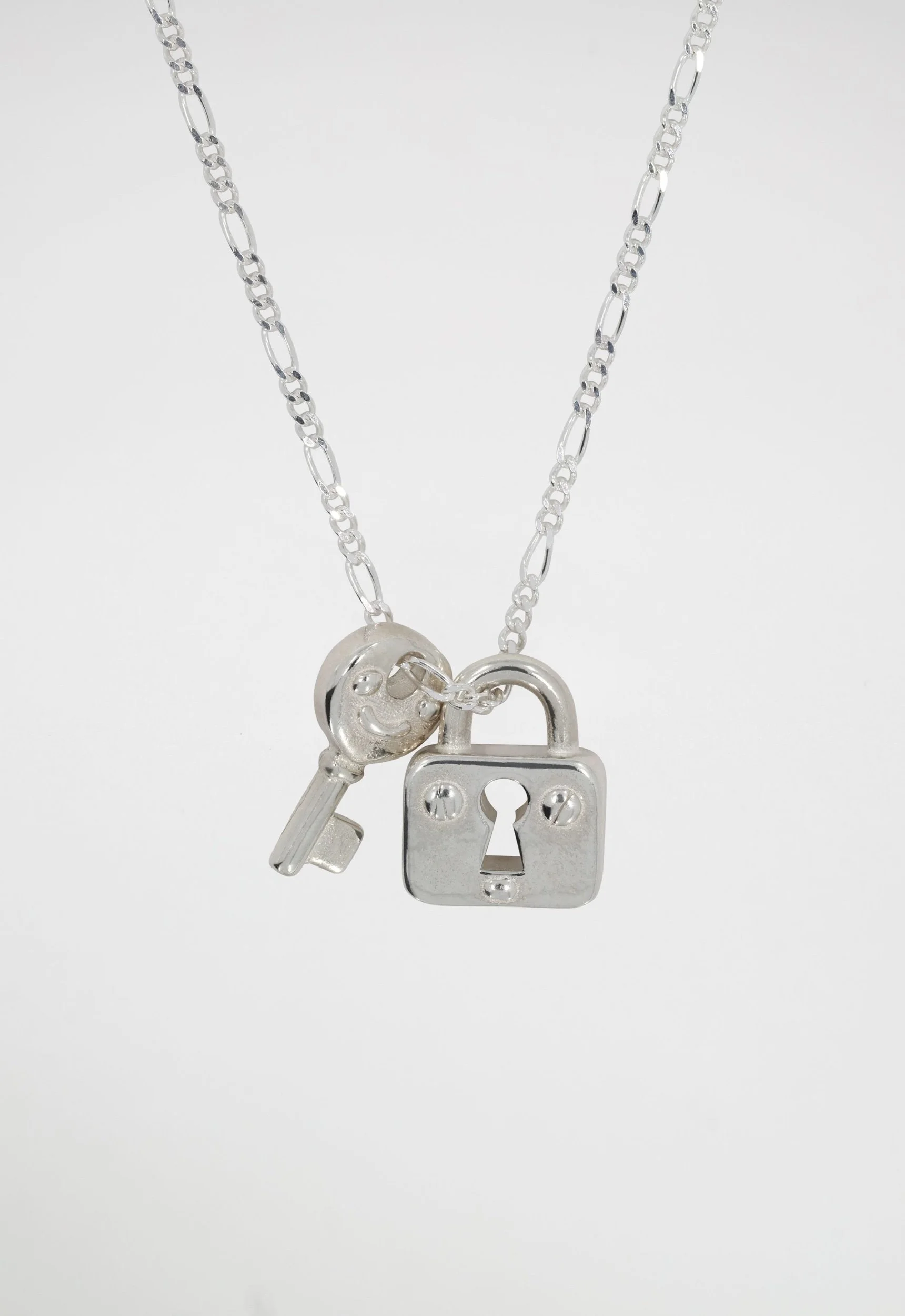STERLING SILVER REVERSIBLE LOCK AND KEY PENDANT, 18INCH STERLING SILVER FIGARO CHAIN. A PERFECT AND PLAYFUL GIFT FOR YOUR LOVED ONE.